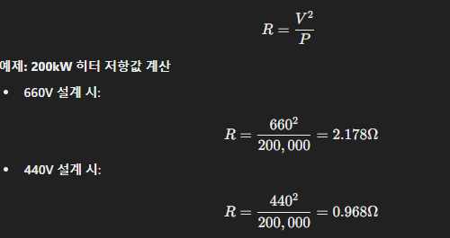 ➡ 설계 방향: 200kW 히터는 전류 부담을 줄이기 위해 660V 또는 440V 시스템이 적합함.