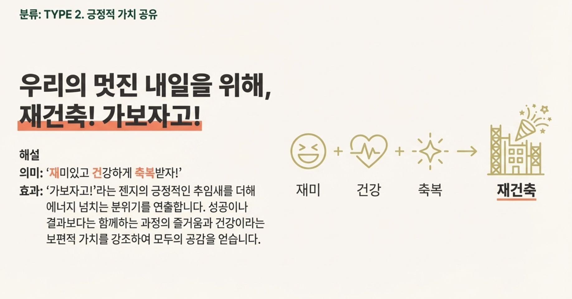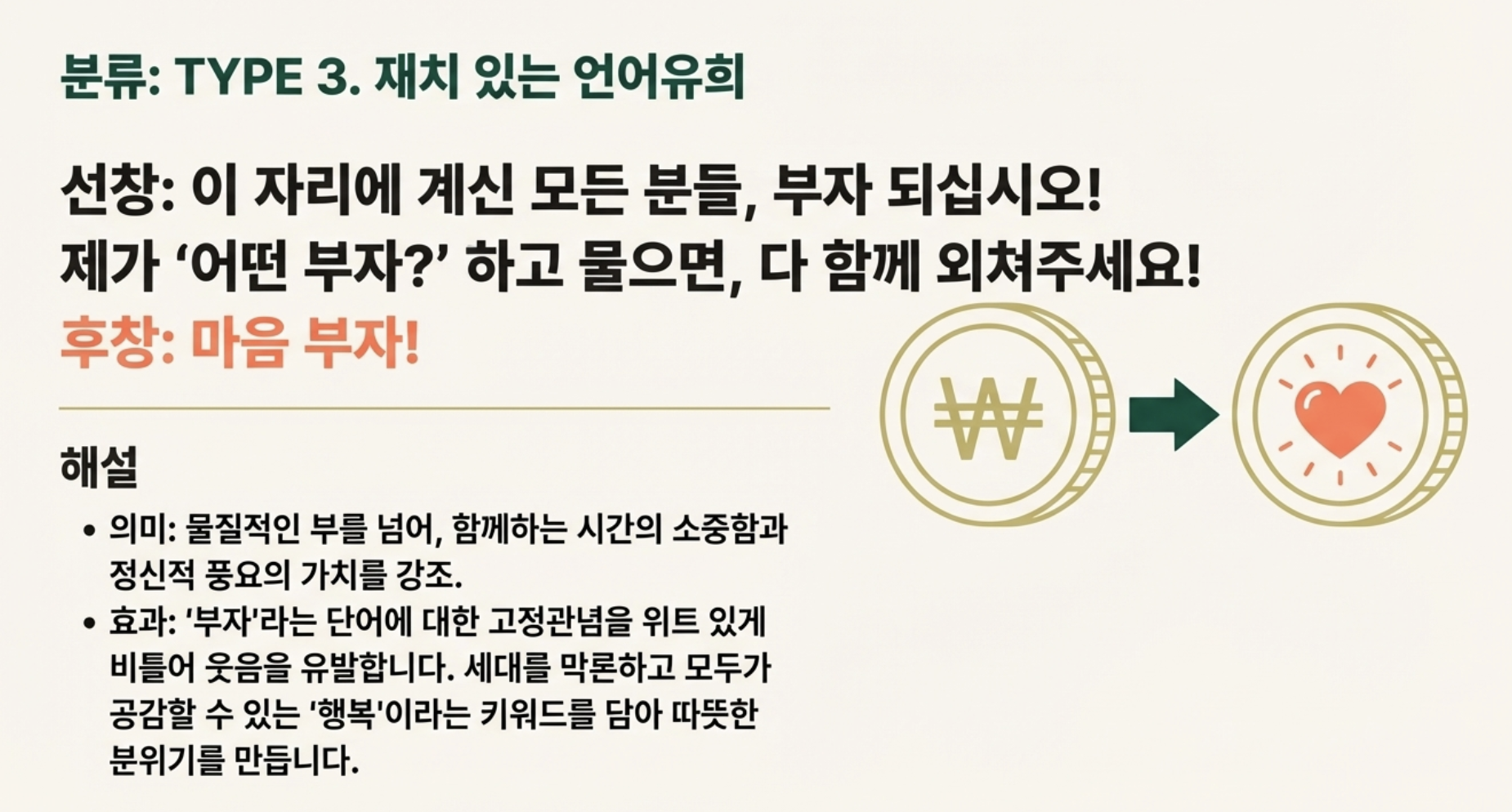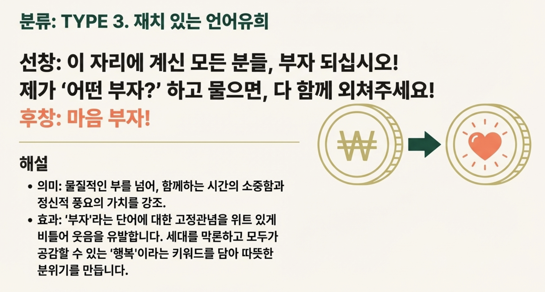 밈 활용형은 공감과 웃음을 빠르게 만들 수 있지만, 참석자의 연령대와 이해도를 고려해야 합니다. 모두가 알 만한 표현으로 짧게 구성하는 것이 안전합니다.