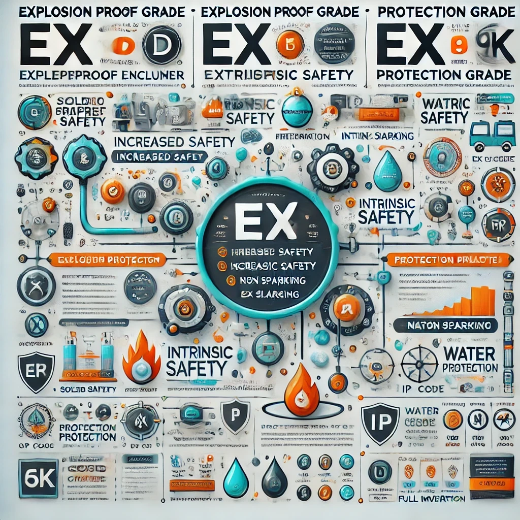 - 방폭 등급은 가스, 분진, 점화 가능한 섬유 환경 모두에 대해 다양한 보호 방식과 표면온도 기준을 갖습니다.