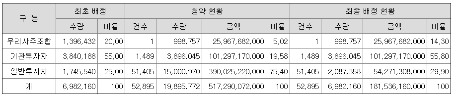 | 우리사주조합 (공모주주) | 1,396,432주 | 2.00% | 유통제한 |